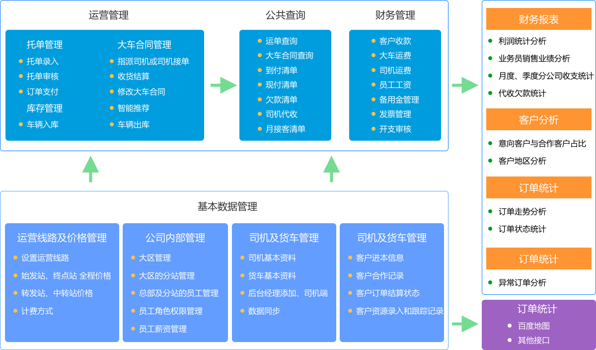 灵活多样的配车调度方式,节约人力物力 实时定位,运输路线全程跟踪,动态轨迹回放,一目了然 预警通知,异常填报,突发事件及时知晓,确保安全将货物送达 智能拆分订单,匹配运输路由 接口全兼容,完美对接各类系统订单管理系统开发
