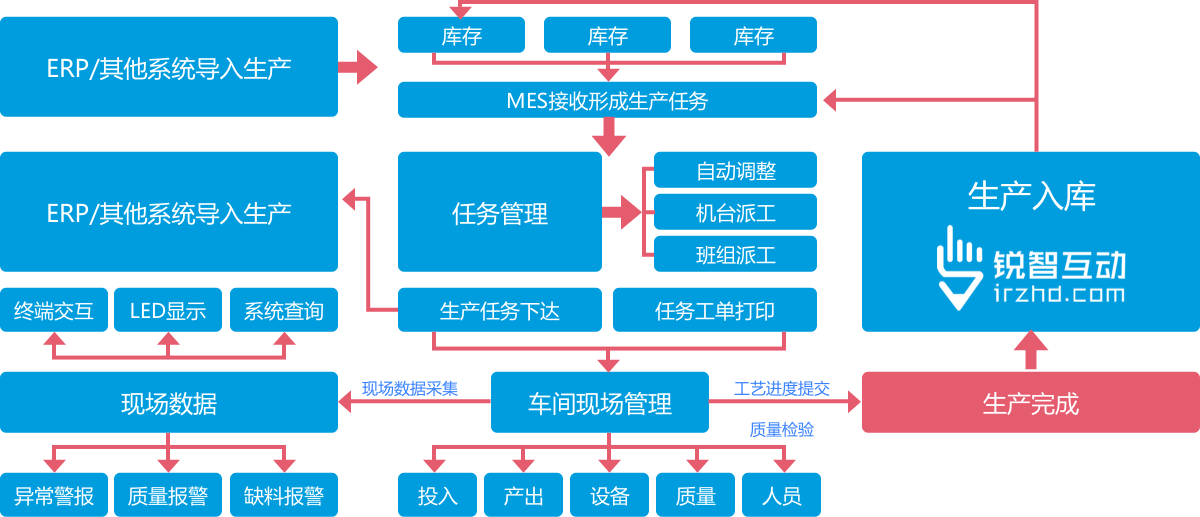 锐智互动MES定制开发可根据工厂实际运转方式灵活配置,工厂中的每个角色都可以快速的获取协作所需的数据信息,帮助您更好的改善实际生产效率和质量,通过对生产需求、生产资源和生产目标全面掌握,充分激发信息透明优势,让您更有信心的去面对各种生产难题!实现数据驱动制造,完成智能工厂升级。